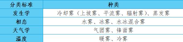 雾通常是由以下几方面原因生成的:一是由于夜间地表的辐射冷却而形成的辐射雾,多出现于晴朗、微风、近地面水汽比较充沛的夜间和早晨。“早晨地罩雾,尽管晒稻谷”,清晨的辐射雾常预示着当天有个好天气。二是暖湿空气流经冷表面时,空气降温而形成的平流雾,水汽的水平输送是平流雾的主要成因。“移舟泊烟渚,日暮客愁新”中的“烟渚”指的就是新安江面出现的平流雾。三是潮湿空气沿着山坡上升时,绝热膨胀冷却而形成的上坡雾,常见于丘陵、山区。四是暖水面蒸发的大量水汽遇冷空气凝结而形成的蒸发雾。除了基于形成过程进行分类外,雾还有多种分类方法,如下图所示。