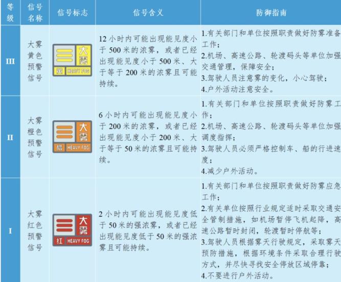 气象部门根据水平能见距离的不同,将雾分为轻雾、大雾、浓雾、强浓雾和特强浓雾。当能见度小于500m时,地方气象部门将发布大雾黄色预警信号,若能见度进一步下降,还可发布大雾橙色和红色预警信号,如图所示。