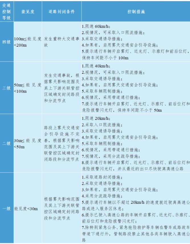 研究表明,在高速公路上,当大雾能见度下降到500m时,小型车平均速度开始缓慢下降,但下降并不明显,大型车平均速度无明显变化,说明此时大雾对驾驶人的影响还比较小;当能见度下降到200m时,车辆平均速度均出现急剧下降,说明大雾对驾驶人造成影响较大,威胁到高速公路的交通安全。我国高速公路天气风险预警、安全控制等相关标准多以能见度500m、200m、50m作为阈值进行划分。《雾天高速公路交通安全控制条件》(GB/T 31445-2015)根据能见度将交通控制等级划分为四级,如下图所示。