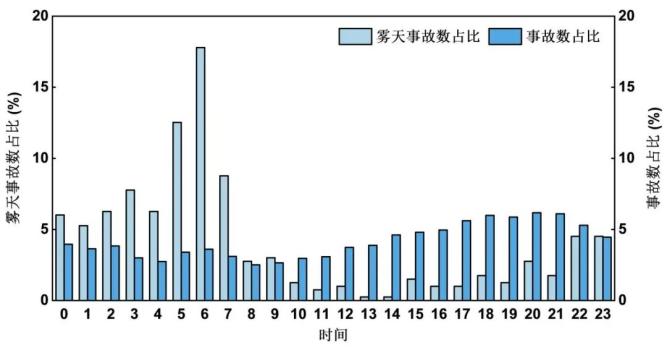 雾天是对交通安全影响最大的恶劣天气之一。我国交通事故统计表明,在各类不利天气条件下,雾天事故的死伤率高于雨天和雪天。美国国家公路交通安全管理局(NHTSA)致死事故报告系统(FARS)的数据也印证了雾天对于道路交通安全的危害严重性,其2023年雾天共发生399起致死事故,造成466人死亡。进一步分析发现,雾天事故在时间分布上呈现出与整体事故趋势显著不同的特点,如下图,其发生主要集中在夜间至清晨时段,尤其在5时至7时最为突出。这与辐射雾易在清晨形成的气象规律高度吻合。无论是客观的事故数据还是主观的驾驶人感知,都清晰地反映出雾天对驾驶安全构成的严峻威胁。