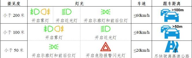 另外需注意,雾天驾车切勿开启远光灯。远光灯射出的光线被雾气漫反射,在车前形成白茫茫一片,不仅无法增加可视距离,反而会严重影响视线,增加行车风险。在雾天环境下,驾驶人应该勤按喇叭主动示意,引起其他车辆的注意,如果听到对向车辆鸣喇叭,也要及时鸣喇叭回应,示意自己的位置。(2)降低车速,控制车距