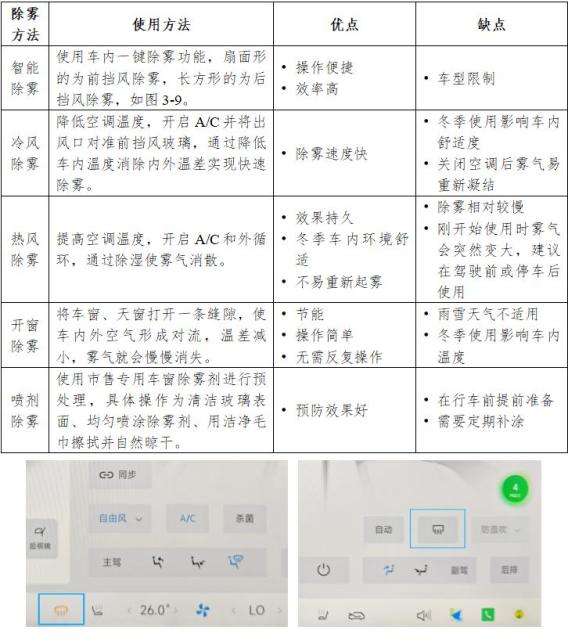 (3)合理使用空调清除雾气秋冬季气温低,车内外温差大,车窗容易起雾,行车前可使用空调暖风除去车内雾气,用毛巾擦拭清理车窗,也可喷淋除雾剂,避免挡风玻璃和后视镜起雾;行车过程中遇到前挡风玻璃起雾时,应及时使用空调冷风清除雾气,或稍微打开车窗,各种除雾方法的对比见下图。