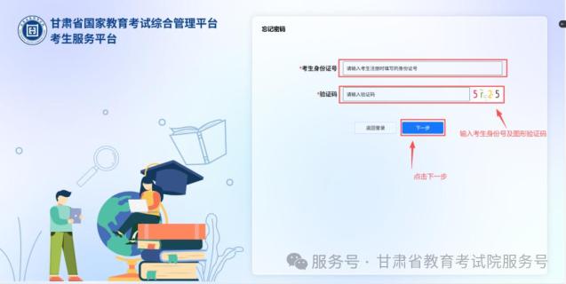 点击“忘记密码”后,输入注册时填写的考生身份证号及页面显示的图形验证码,点击 “下一步”。若系统提示 “考生未注册”,需返回登录界面完成账号注册;