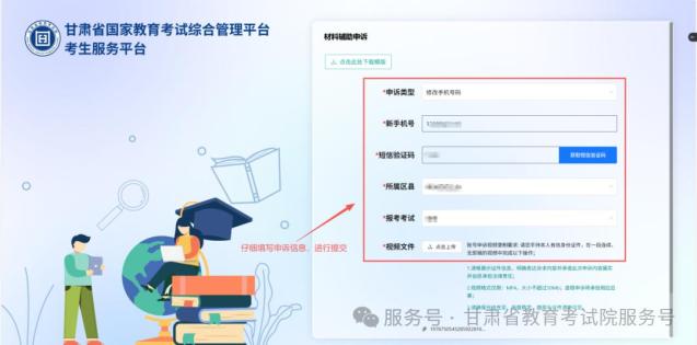 点击“材料辅助申诉”,考生需填写新手机号码,考生所属县(市、区)及报考考试的名称,同时根据页面提示和要求拍摄一段无剪辑连续的身份证明视频并提交至所属县(市、区)教育考试招生机构进行审核。