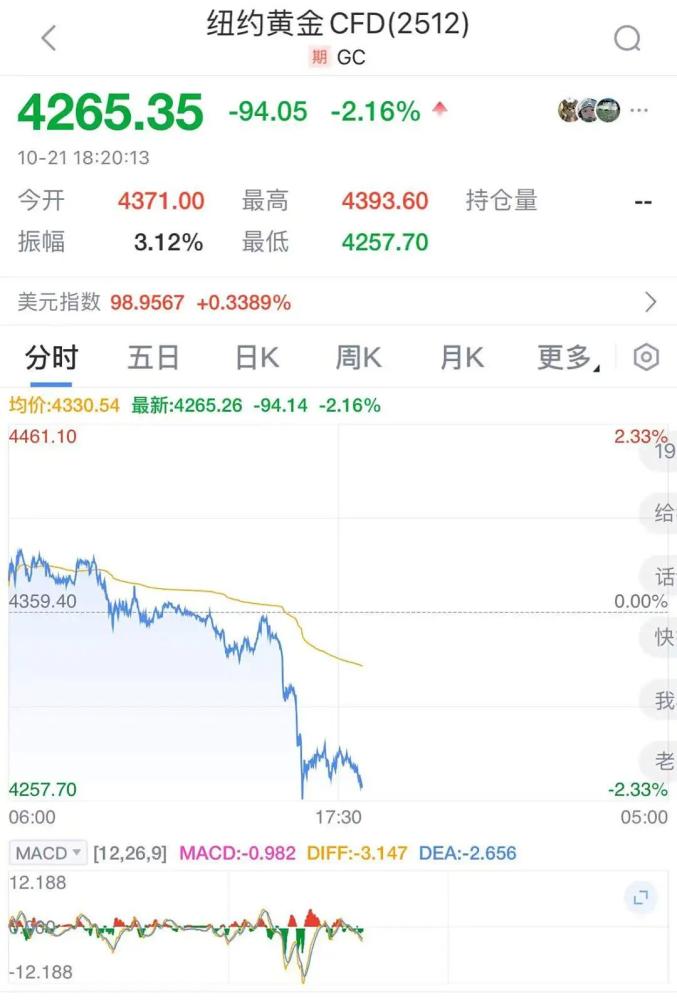 截至18:20,伦敦现货黄金大跌超2%,报4265美元/盎司,盘中一度急跌至4257美元/盎司。现货白银跌超4%,报50.13美元/盎司。