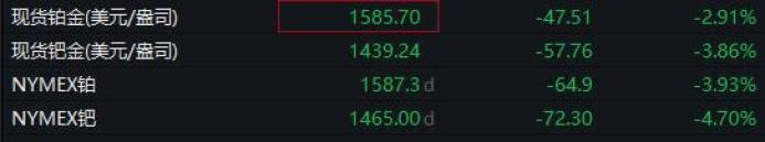 事实上,不仅黄金白银,整个贵金属市场全线下跌,截至发稿,现货铂金跌近3%,NYMEX铂跌近4%,此前均一度跌超5%;现货钯金跌3.86%,盘中一度跌超5%,NYMEX钯跌4.7%,盘中一度跌超6%。