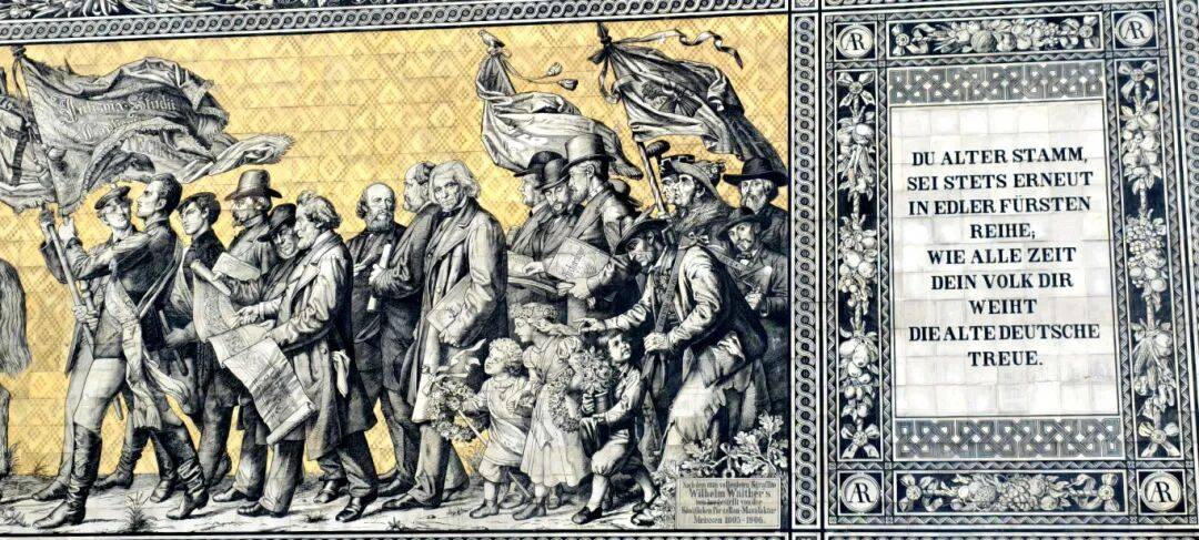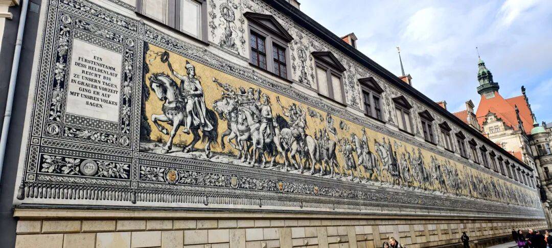 注:1.《德累斯顿出征图》,又名《王侯队列图》,其墙体长约102米,由27000块瓷砖构成,是世界上最大的陶瓷艺术品,记录了造势英雄史诗。其中镌刻有工匠执展设计图,忝列被记录者之后,可谓留得属于自己的“半首自由诗”。