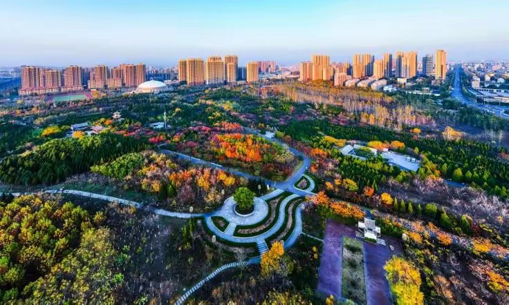 东山公园位于章丘区双山大街与经十东路交叉口,以黄栌树为主,秋季层林尽染,景色如画。环形步道沿途黄栌树形成“红叶走廊”,山顶文昌阁可俯瞰全园红叶与城区风貌。