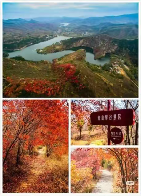 红山翠谷是位于章丘区垛庄镇的秋日赏红叶胜地,以野生黄栌林形成的红色海洋景观闻名,核心景点天空之镜玻璃栈道可俯瞰百丈崖水库全景。