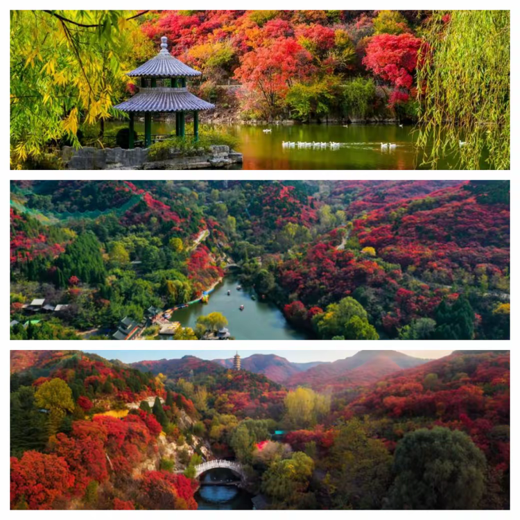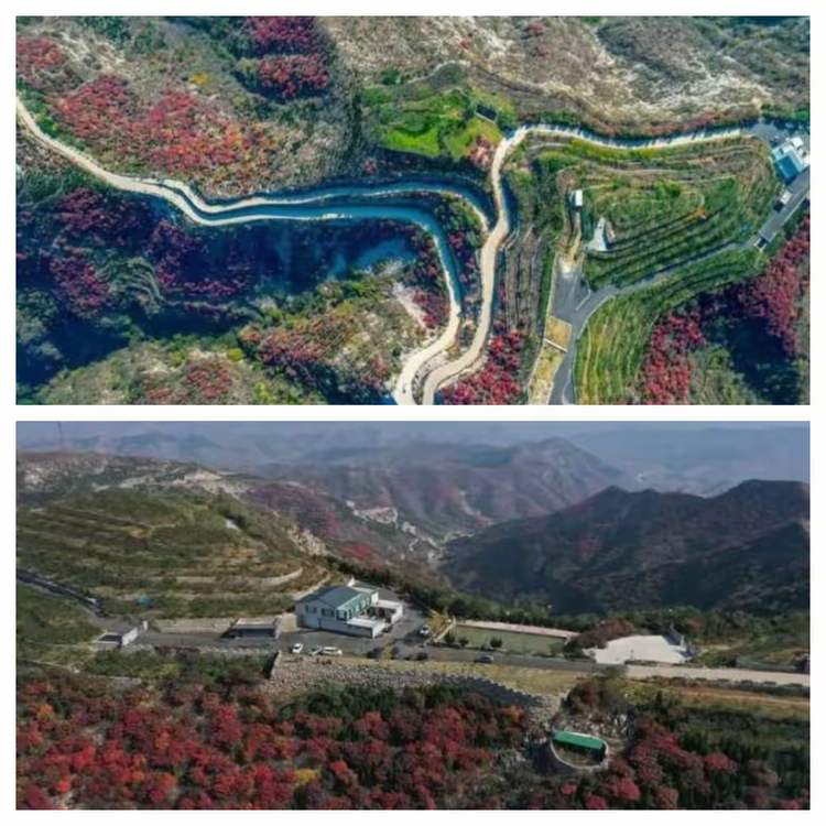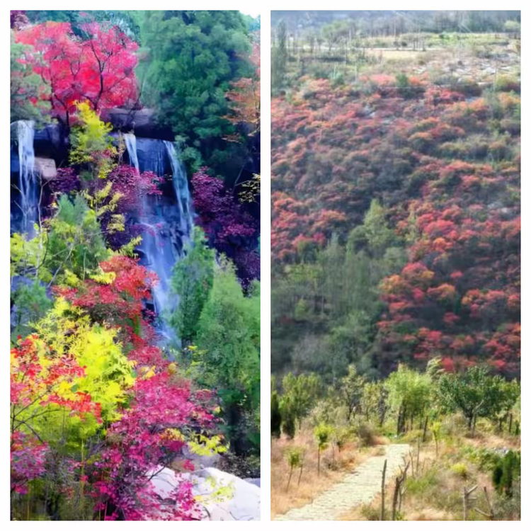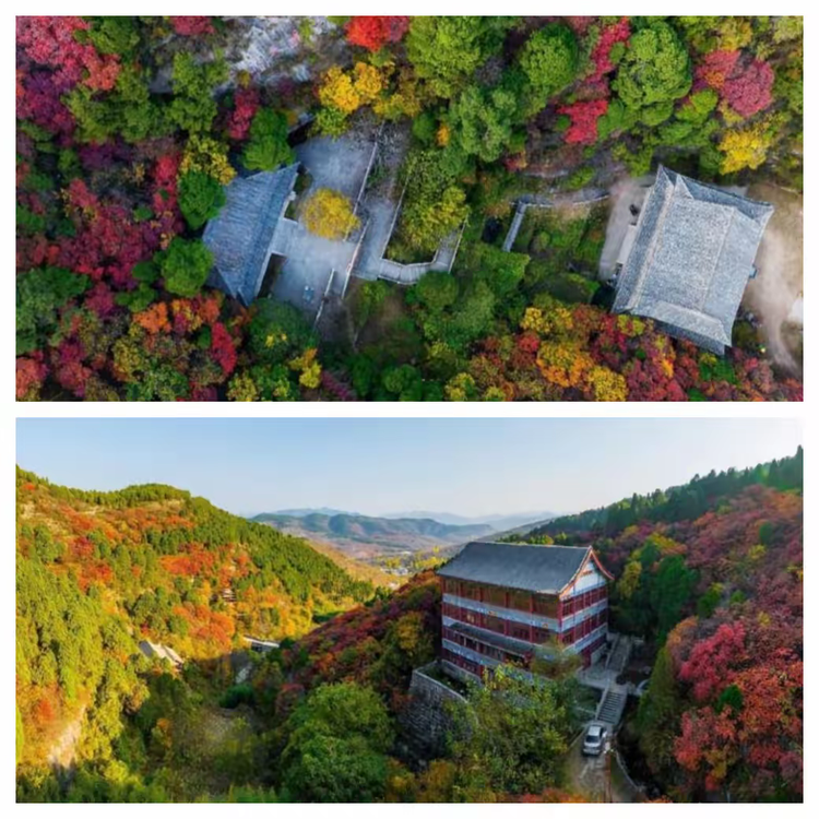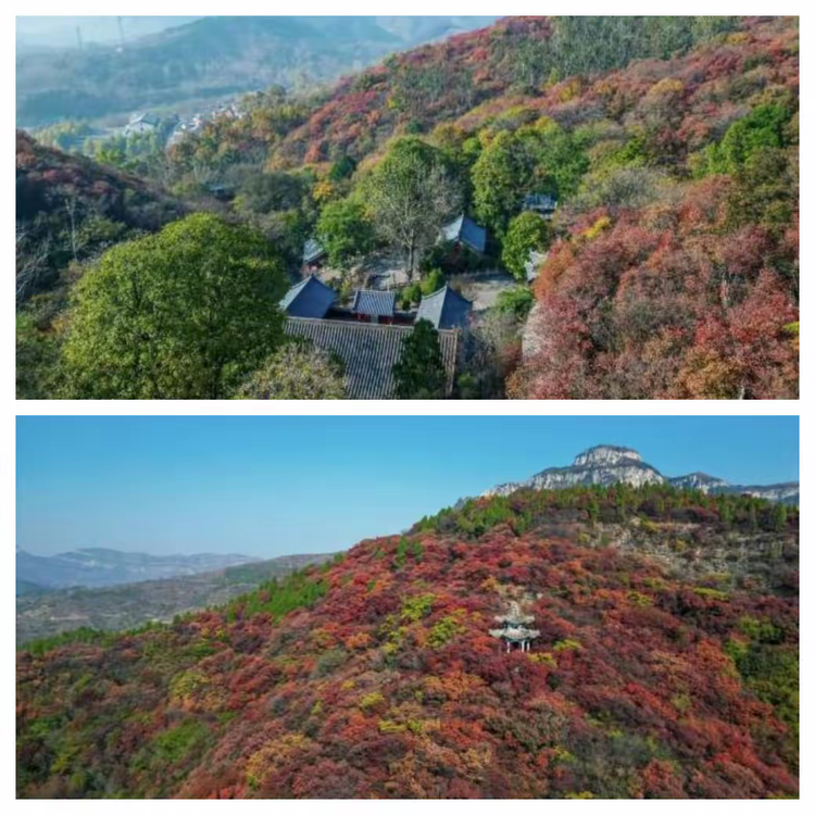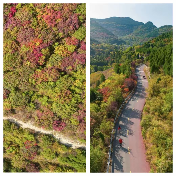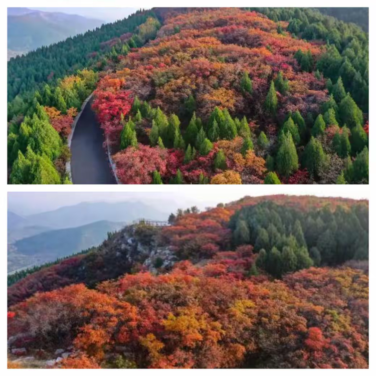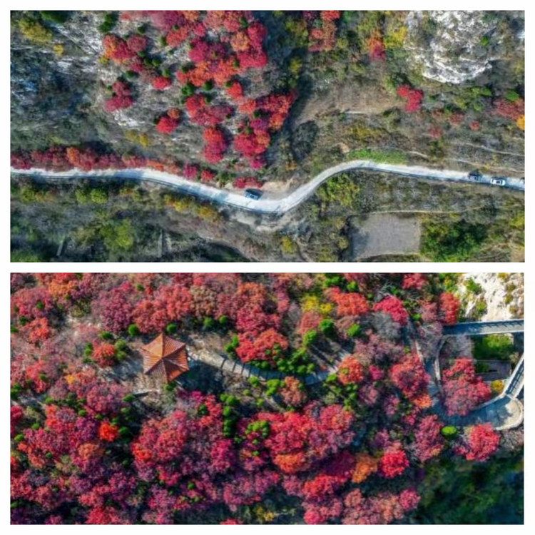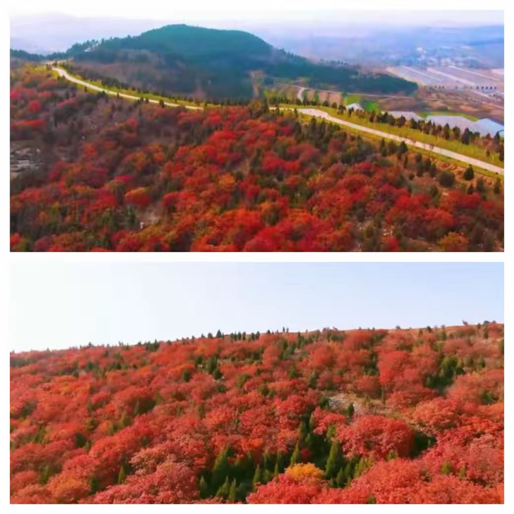 赵家岭与三王峪同处济南市章丘区曹范镇,可沿黄楼路串联观赏,两地漫山遍野皆是黄栌与红枫,红叶覆盖范围极广,从错落的山峪、起伏的山梁到绵延的山脊,处处皆是热烈绚烂的红色,共同勾勒出“万山红遍、层林尽染”的秋日壮阔画卷。