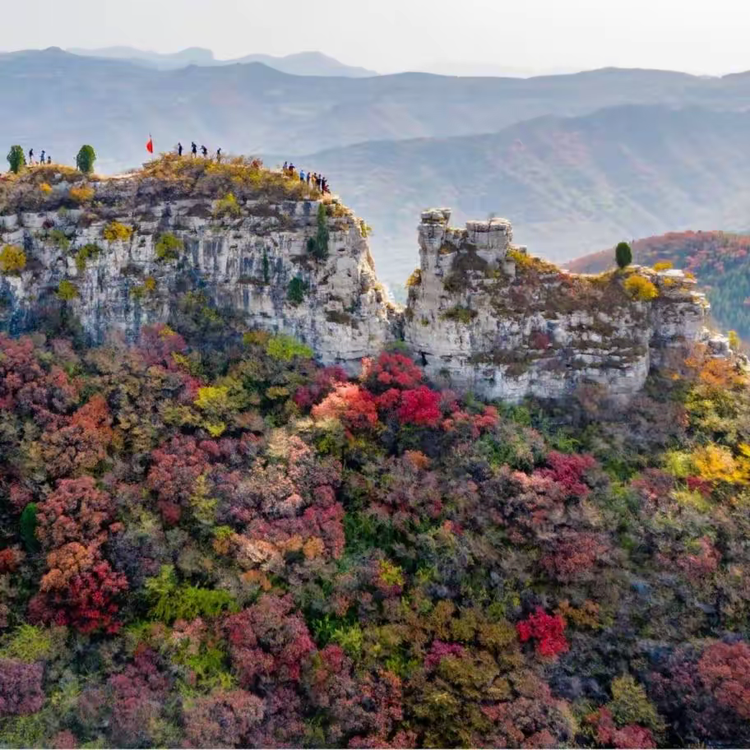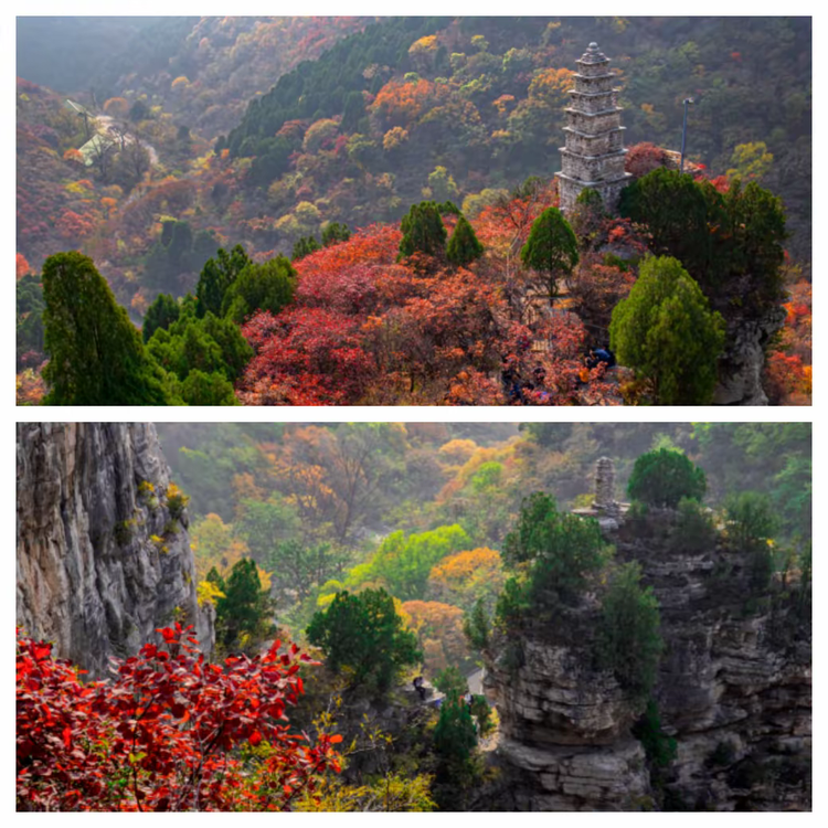 藏龙涧位于龙洞风景区,10月中旬至11月上旬进入最佳观赏期,喀斯特峭壁上的黄栌红得热烈,与深涧构成绝美画卷,登至一线天观景台可俯瞰整个峡谷,报恩塔的古朴轮廓与层层叠叠的红叶同框。