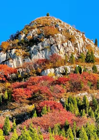 莲台山位于济南市长清区张夏街道,11月中旬红叶进入最佳观赏期,主要有黄栌、红枫、白蜡等。这些树种的叶子经霜变红,与其他仍保持绿色、黄色的树叶相互交织,形成五彩斑斓的景观,呈现出“层林尽染”的壮丽画面。