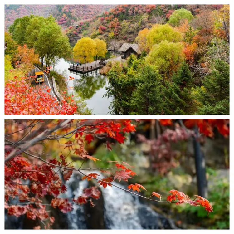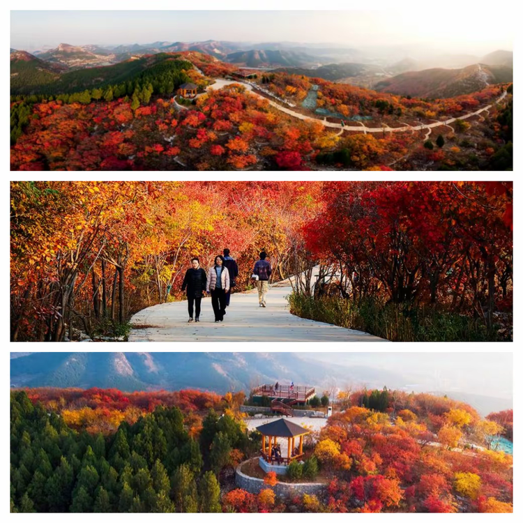 九如山海拔超800米,秋天漫山红枫点燃山野,山风掠过时,整片枫林簌簌摇动,沿着木栈道拾级而上,每一步都踩碎一地斑斓。峡谷内,层林尽染,美不胜收,斑斓的色彩如同打翻的调色盘,绘就出一幅独属齐鲁大地的浓墨重彩的秋日画卷。