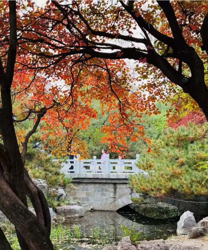 10月底至11月上旬红叶渐入佳境,山间步道被红叶环绕,走在其中仿佛闯入“红色隧道”山顶观景台是必打卡点,能拍红叶与扳倒井立交桥合影的美景。