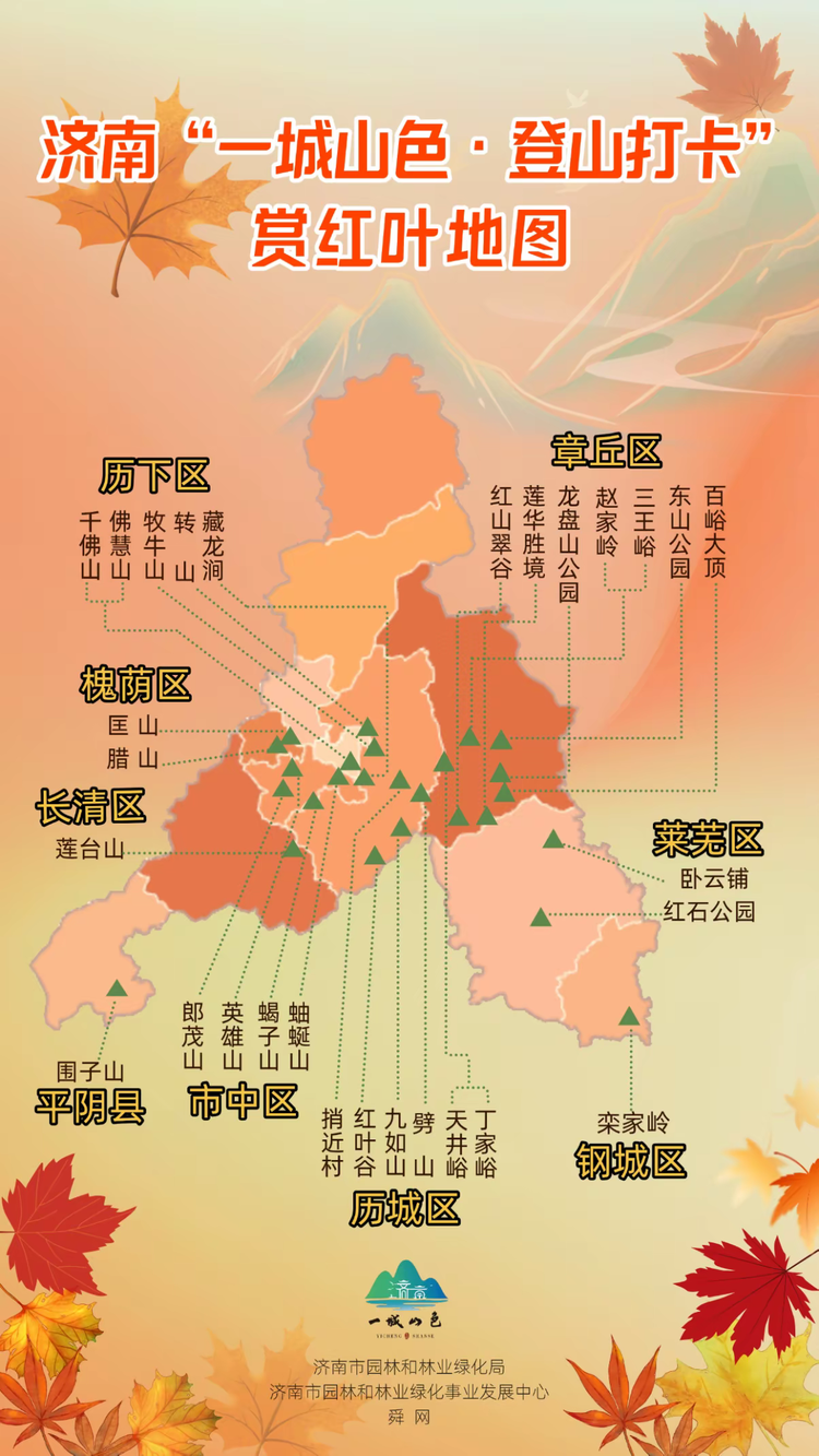 10月中下旬至11月中下旬是济南赏红叶的最佳时节,今日为市民游客奉上「济南“一城山色·登山打卡”赏红叶地图」,涵盖多处红叶观赏地。不妨暂别喧嚣,把生活交给山林,漫步济南一城山色间,拥抱秋季的色彩斑斓,将这份独属于济南的秋日浪漫装进口袋!
