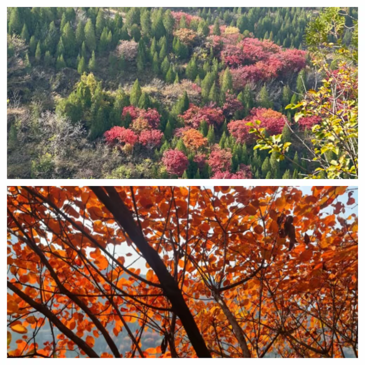 郎茂山南侧的两座主峰上长满了松柏和黄栌,漫山红叶与青松翠柏交织,落叶五彩缤纷,登高远眺,景色十分优美。