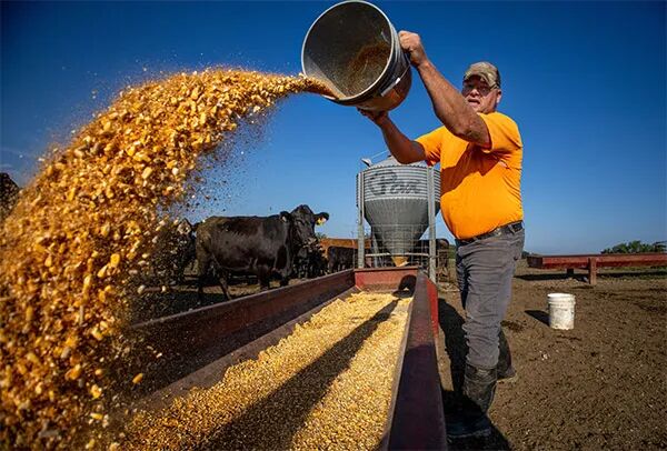 美国艾奥瓦州农民向牛群投喂玉米饲料 路透社