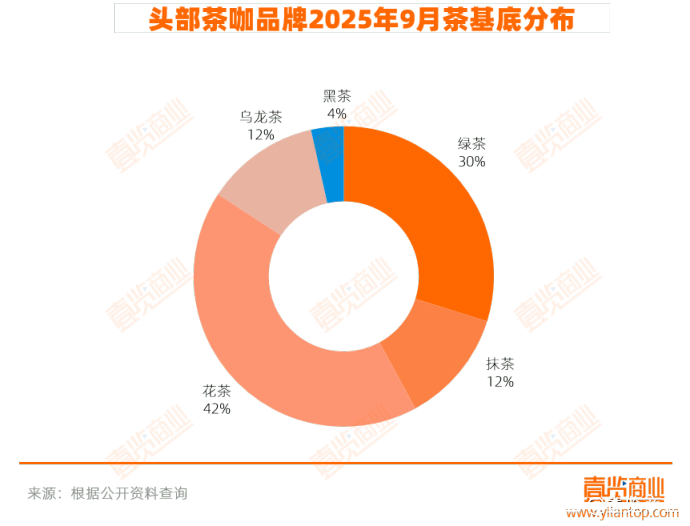 9月,茶咖品牌们选用了5款茶底,其中,使用最多的仍为花茶,其次是绿茶,使用最少的是黑茶。