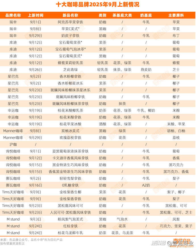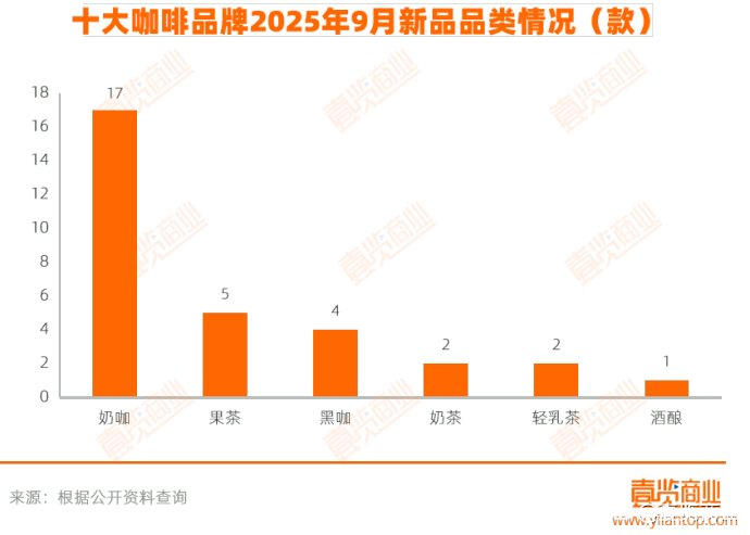 咖啡新品同样呈现出厚重化倾向,奶咖类产品成为推新重点。9月,咖啡品牌共推出17款奶咖新品,占当月咖啡新品总量的54.8%,同期果咖与黑咖的新品数量分别为5款和4款。