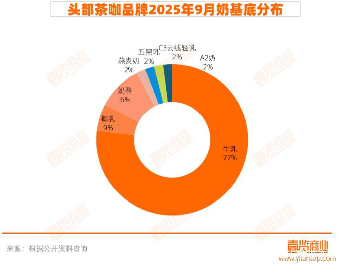 从奶基底看,牛乳仍然是经典且普遍的选择,共计使用了40次,占比77.0%;其次为椰乳,占比9%。此外,在本轮上新中,酸奶基底并未被使用,或许反映出品牌在秋冬产品线上更倾向于浓郁、醇厚而非清爽的质地。
