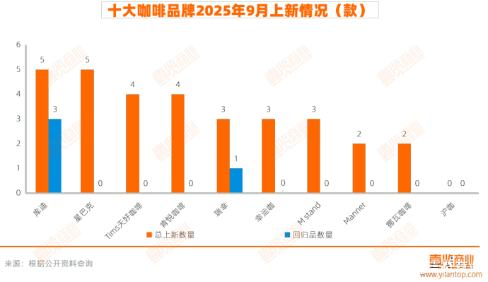 咖啡品牌中,库迪和星巴克上新最为活跃,各有5款新品上市;Tims天好咖啡与肯悦咖啡并列其后,分别推出4款新品。其他咖啡品牌在9月也保持了稳定的推新频率,上市2至3款不等。