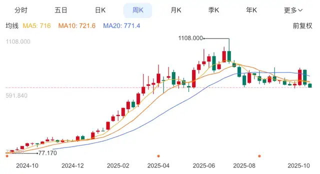 今年以来,老铺黄金股价曾一路狂飙,7月11日一举触及1108港元最高点(对应市值约1916亿港元),较40.5港元的发行价涨幅超26倍。但在这之后,老铺黄金股价震荡下行,截至10月28日收盘价停留在667.5港元,股价回调幅度将近40%,市值也回落至1153亿港元。