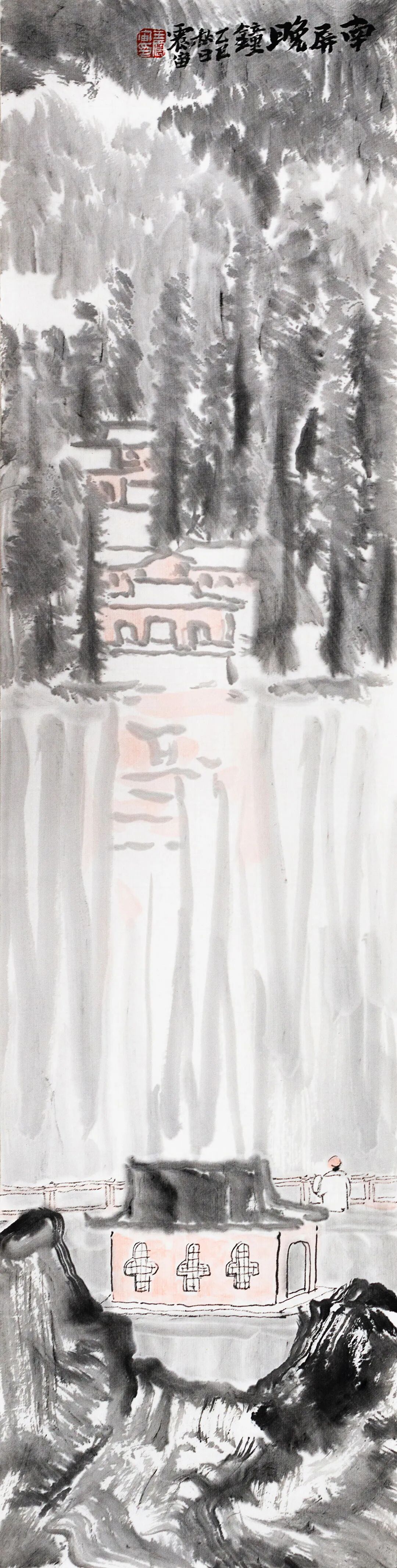 ◎南屏晚钟-纸本设色-68x17cm-2025