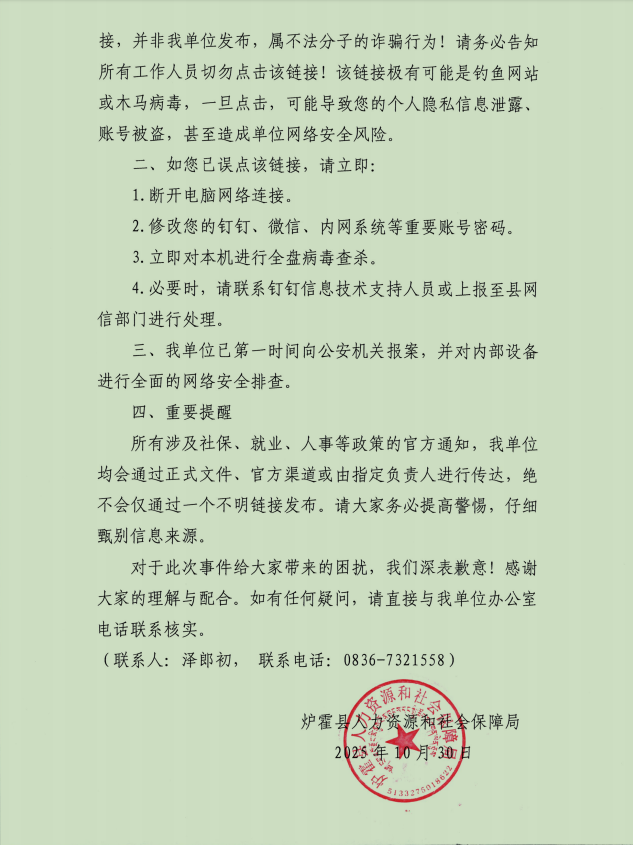 炉霍县人社局微信公众号公布的通知指出,该非法行为具体表现为,冒用该单位工作人员名义,通过PC版钉钉编辑并发布名为“办公室通告【社保新规】”的虚假信息。此条“办公室通告【社保新规】”信息及其附带链接,并非县人社局发布,属不法分子的诈骗行为!请务必告知所有工作人员切勿点击该链接!该链接极有可能是钓鱼网站或木马病毒,一旦点击,可能导致您的个人隐私信息泄露、账号被盗,甚至造成单位网络安全风险。
