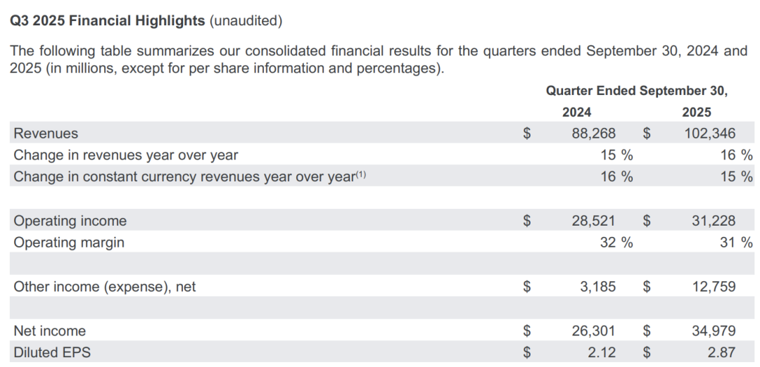 净利润则为349.8亿美元,与去年同期相比增长了33%,其中营业利润为312亿美元,营业利润率为30.5%,每股收益(EPS)为2.87美元,同比增长35%。
