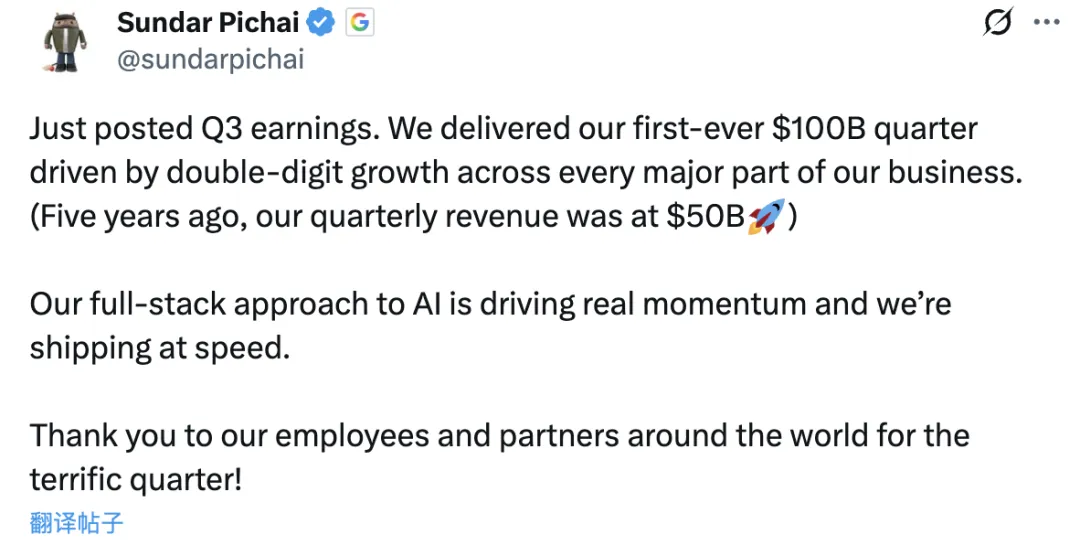 谷歌CEO桑达尔·皮查伊(劈柴哥)激动地宣布了这一结果,表示他们所采用的全栈式AI策略推动了这一增长。