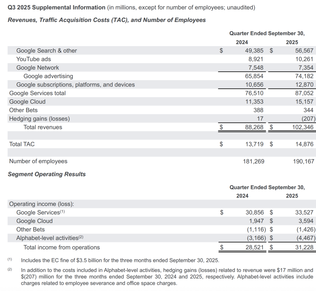其中包括Google搜索与其他广告收入565.7亿美元、YouTube广告收入102.6亿美元,以及订阅/平台/设备收入128.7亿美元。