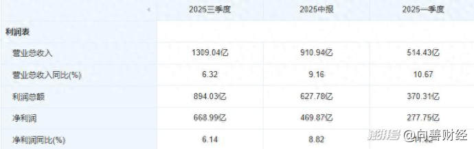 由于第三季度业绩整体放缓,今年前三季度茅台的营业总收入为1309.04亿元,同比增长6.32%,归母净利润646.26亿元,同比增长6.25%。