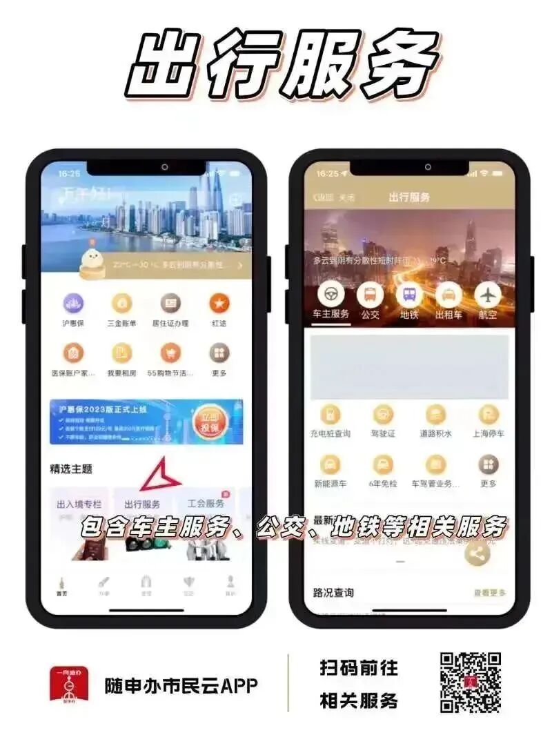 “随申办市民云”APP【出行服务】专区,还包括公交到站实时查询、航空、景点热力图等服务,快扫描下方二维码,解锁更多实用服务吧