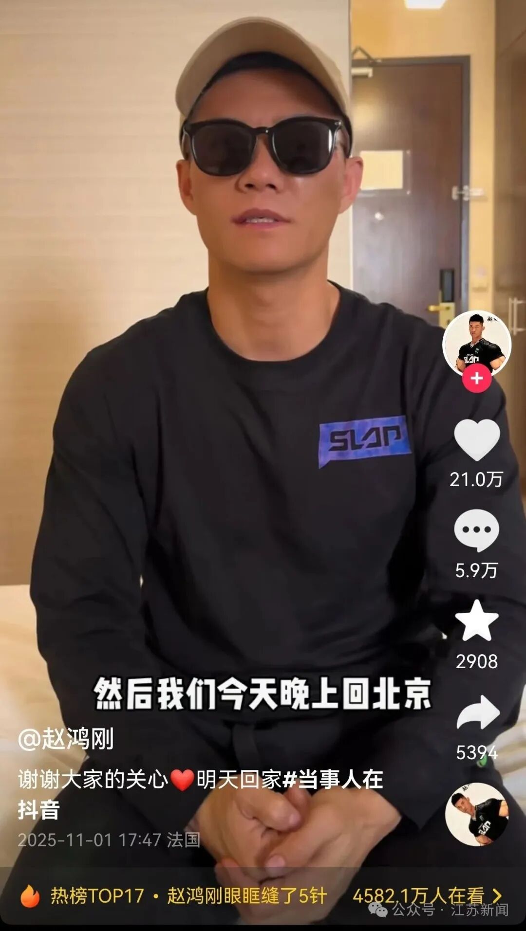 随后,赵鸿刚在社交平台分享自己的伤情,他表示,经过医院系统的检查,没有脑震荡,只是颧骨有点骨裂,眼眶缝了5针。计划今晚回国,感谢大家的关注。