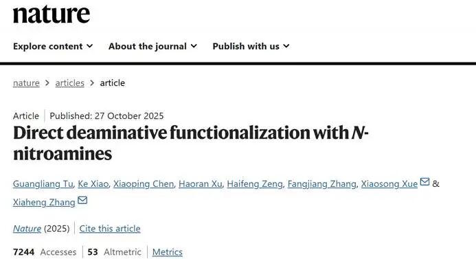北京时间10月28日,国际权威期刊Nature发表了国科大杭州高等研究院(以下简称“杭高院”)化学与材料科学学院(以下简称“化材学院”)研究员张夏衡团队最新成果——“Direct deaminative functionalization with N-nitroamines”。该成果受到Nature四位主审稿人的高度评价,作为审稿人之一的国际制药巨头辉瑞公司高级研发总监Scott Bagley给予评价:“true tour de force”(法语:真正的杰作)。