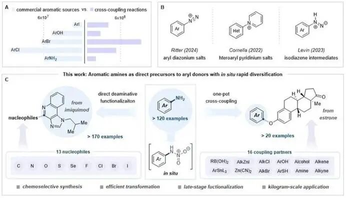 为此,张夏衡团队创新性地提出了一种以 N-硝胺为媒介的直接脱氨官能团化策略。该方法可在温和条件下,将惰性的芳香 C–N 键一步转化为 C–X、C–O、C–N、C–C 等多种化学键,反应仅需常规试剂即可实现公斤级放大,收率优异、操作安全。相比多年来依赖高危险芳基重氮盐的工业流程,新方案彻底摒弃易爆中间体,为制药、先进材料等领域提供了绿色、经济、可规模化的通用技术平台。