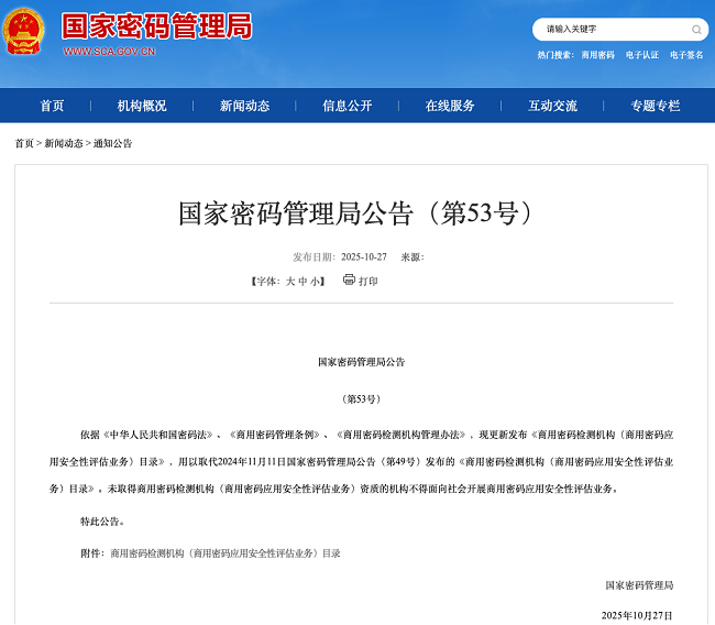 2025年10月27日,国家密码管理局发布公告(第53号),公布了最新版的《商用密码检测机构(商用密码应用安全性评估业务)目录》,中国电子院下属道普信息技术有限公司(以下简称“道普信息”)作为全国首批密评试点单位,正式获得商用密码检测机构资质,标志着道普信息在商用密码检测领域的技术能力、服务水平获得国家认可。