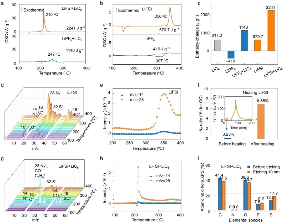 同时发现LiFSI自身分解是放热的,LiC6负极的引入使其分解温度从350 oC提前到210 oC,同时放热量以及反应烈度大幅度上升(热焓从579.7升高到2241 J g-1)。相比之下,LiPF6自身分解吸热,同时和LiC6负极的反应比较温和。进一步从LiFSI本征稳定性进行研究,通过热重-质谱连用(TG-MS)和气相色谱(GC)等研究发现LiFSI热分解过程会产生N2,SOx,NOx等气体。其中N2的形成是首次发现,N2高的键能导致形成过程中释放出大量热量。LiC6负极加入后不仅加速了LiFSI的分解快速形成N2,同时和LiFSI发生进一步的反应生成CO2,C2H4等气体。