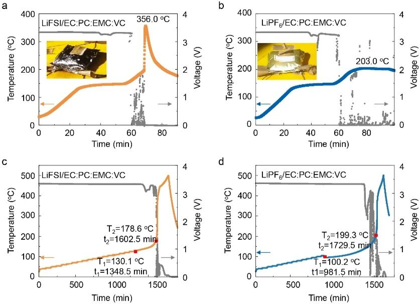 研究团队分别将使用LiFSI和LiPF6基电解液的满电软包电芯(1.4 Ah)进行热箱过热测试,发现使用LiFSI基电解液的电芯在升温到200 oC时中发生了热失控,出现明显火花与烟雾,最高温度达到356.0 oC。而在相同测试条件下使用LiPF6基电解液的电芯未发生热失控,仅出现膨胀,无损坏与温度骤升现象。另外,在ARC测试中,使用LiPF6基电解液的电芯自产热温度(T1)为 100.2 oC,热失控温度(T2)为 199.3 oC,热安全时间窗口(t2-t1)为 748 min;而 使用LiFSI 基电解液的电芯的 T1为 120.2 oC,T2仅为 177.7 oC,t2-t1仅为 254 min,说明尽管使用LiFSI 基电解液的电池具有更稳定的固态电解质界面膜(SEI),但是其更容易发生热失控。