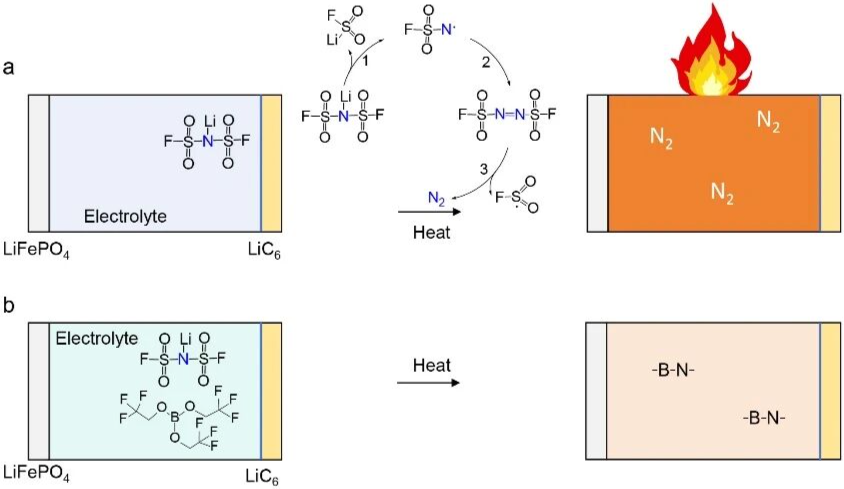 近日,广州天赐高新材料股份有限公司联合华南师范大学南俊民教授团队和清华大学深圳国际研究生院贺艳兵教授团队开展了系统性研究,首次揭示了高含量 LiFSI 基电池的热失控机理:LiFSI 在加热和LiC6负极作用下首先分解生成 NSO2F 自由基,进一步反应形成稳定的N2,此过程伴随大量放热,是引发电池热失控的核心原因;创新性地提出了淬灭NSO2F自由基的设计理念,引入以缺电子硼为中心的三(2,2,2-三氟乙基)硼酸酯(TTFEB)电解液添加剂捕获相应自由基,阻断N2生成以大幅度减少热量释放,使得高含量 LiFSI 基铁锂电芯在热箱过热测试中最高温度从356.0 oC降至257.5 oC、在绝热加速量热(ARC)测试中热失控温度从177.7 oC提升至186.2 oC,同时保证电芯优异的倍率性能(6C时容量达1.27 Ah)及高容量保持率(2000 次循环容量保持90.1%),实现热安全性与电化学性能的协同提升。
