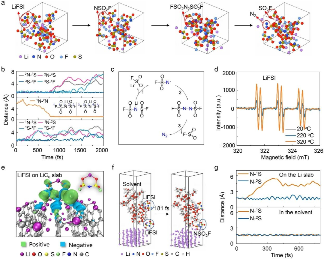 进一步基于从头算分子动力学(AIMD)模拟结合实验去分析LiFSI分解过程。通过观察多个LiFSI分子在高温下反应路径的变化,对N-N、N-S、S-F化学键键长随时间变化曲线进行分析,发现LiFSI 首先分解生成 NSO2F 自由基,再形成不稳定中间体 FSO2N2SO2F,最终分解产生 N2。电子顺磁共振(EPR)数据也印证了含氮自由基的形成。另外将LiFSI分子放入碳酸酯溶剂中和放于锂金属表面进行模拟,发现靠近锂金属的LiFSI的N-S键更容易发生断裂,说明了和锂金属具有类似给电子特性的LiC6能够加速LiFSI的分解。在对LiFSI的热分解机理进行深入研究后,研究团队提出了引入电解液添加剂淬灭NSO2F自由基抑制氮气生成,从而减少热量释放的解决问题思路。