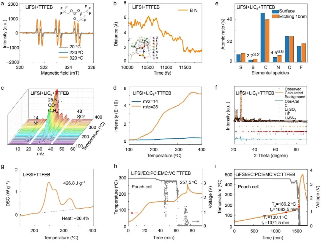 我们采用以缺电子B元素和三氟乙氧基组成的三(2,2,2-三氟乙基)硼酸酯作为电解液添加剂,去实现对NSO2F自由基的捕获。实验表明该添加剂能够有效减少NSO2F自由基的浓度。同时在对LiFSI+TTFEB高温模拟过程中发现,B-O键断裂以及B-N键不断形成。LiFSI+LiC6+TTFEB的高温反应残留物中少量Li3BN2的形成,以及N2的含量减少等现象说明了TTFEB能够抑制LiFSI分解释放氮气,从而减少放热。结果表明,添加2 wt.% TTFEB 的 LiFSI 基电解液不仅能使Gr|LFP电池在热箱过热测试中热失控最高温度从356.0 oC降至 257.5 oC、ARC测试中T2从 177.7 oC提升至 186.2 oC且t2-t1延长至 311 min,同时保证电池展现优异倍率性能(6C容量达 1.27 Ah)及 2000 次循环后 90.1% 的高容量保持率,实现热安全性与电化学性能的协同提升。