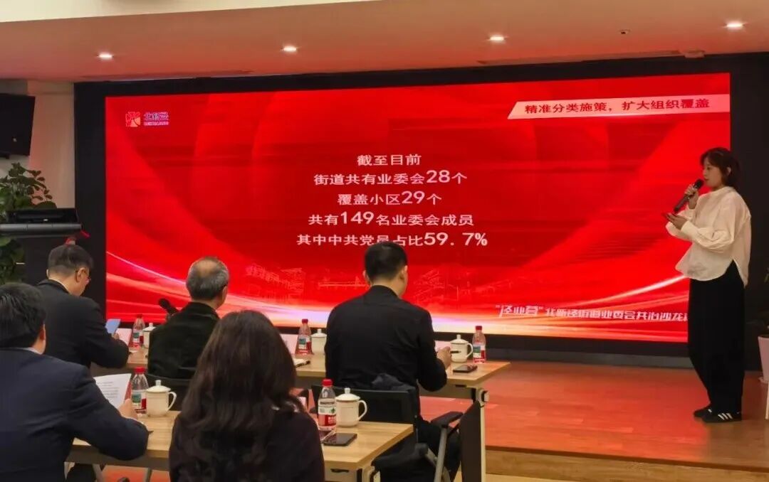 以“泾业荟”成立为契机,首场交流研讨活动于当日举办。活动中,回顾了北新泾街道在推进业委会建设的道路上的和不断探索阶段性成效。过去一年,街道通过制定“一小区一方案”,成立攻坚专班,精准分类施策,扩大组织覆盖,破解了不同小区业委会组建、换届、运转等难题。全年成功新组建2个业委会,推动10余个完成换届,发放备案证11张,实现“组建一个、规范一个、备案一个”。目前,街道共有28个业委会,覆盖29个小区,业委会成员149名,党员占比近60%。