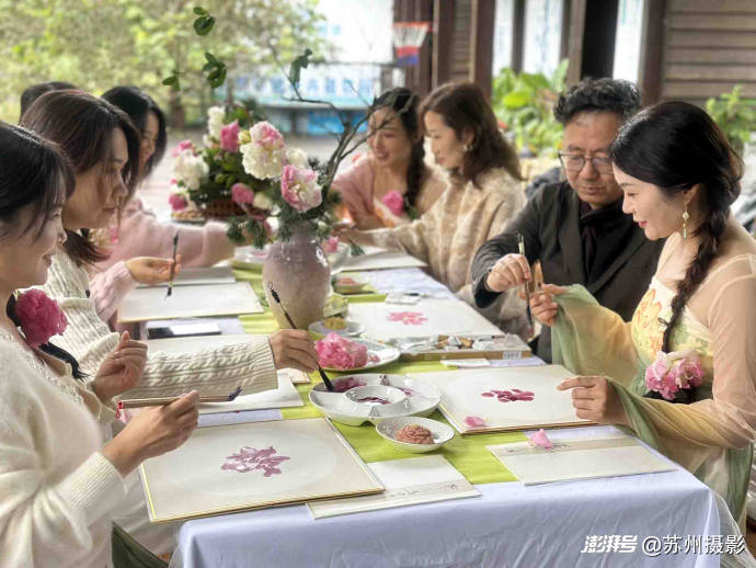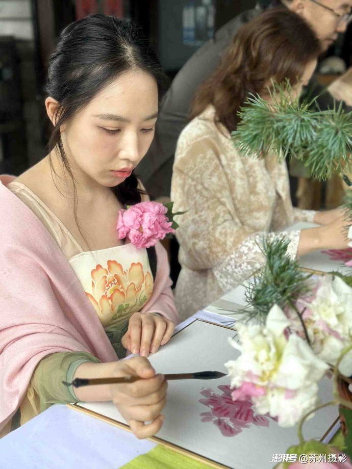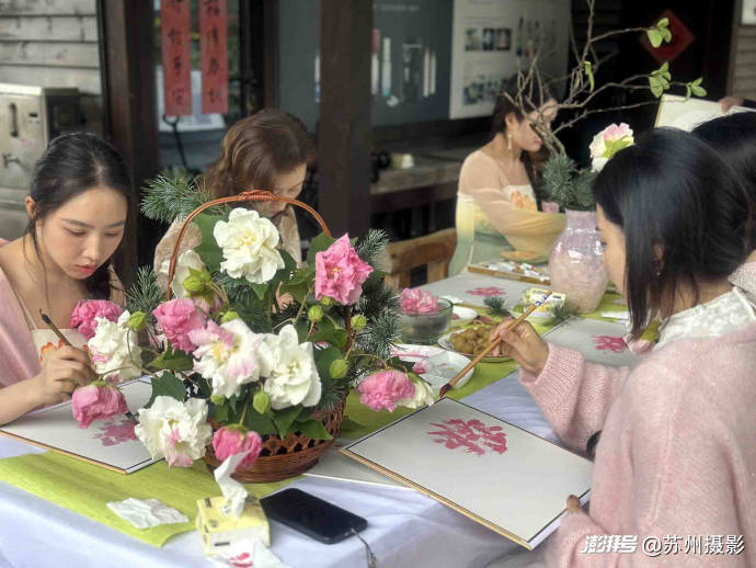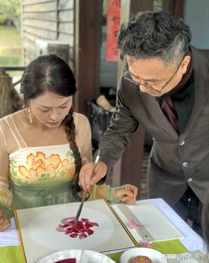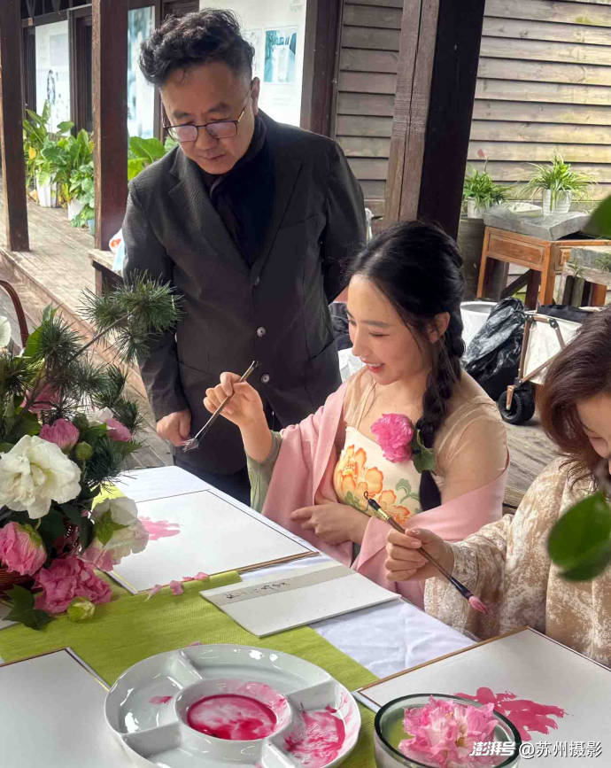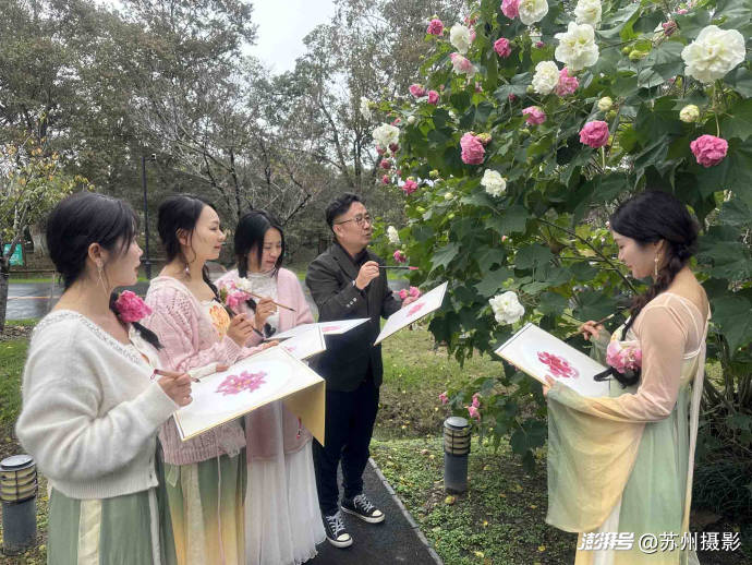 11月7日,这份“拒霜而立”的烂漫,成了苏州中国花卉植物园花王居最动人的布景——“芙蓉花开”主题公益活动在此启幕。苏州广电总台著名主持人、花鸟画家阿丁老师亲任主讲,更将一方素木画案径直搬入芙蓉花丛:案上摆着兼毫笔、生宣挂历与研好的赭石、花青墨汁,抬眼便是枝头盛放的芙蓉,低头可蘸墨落笔,让“师法自然”的中国画真谛,在花叶与笔墨间自然流淌。