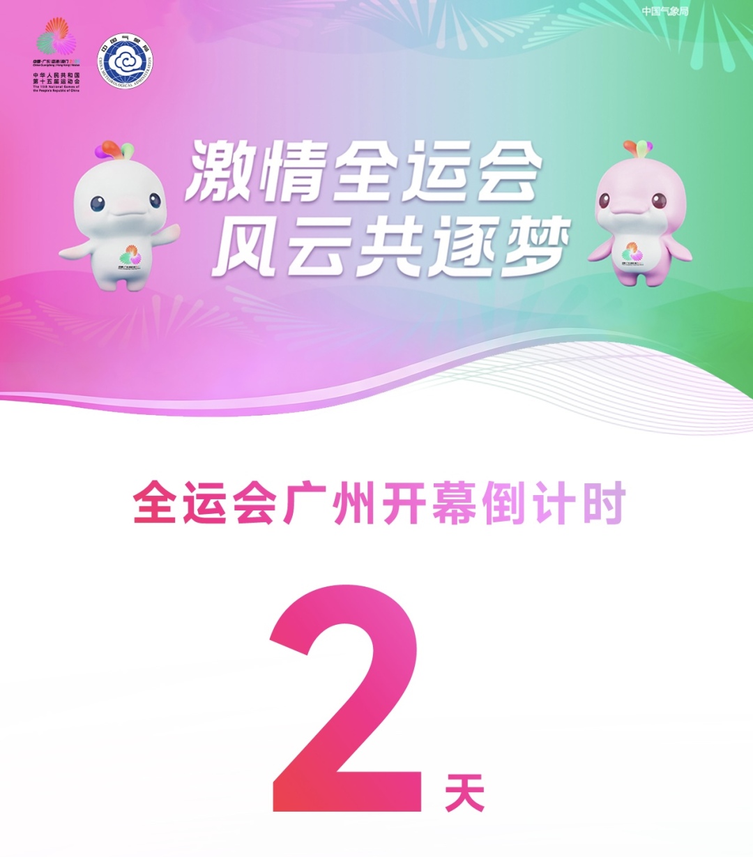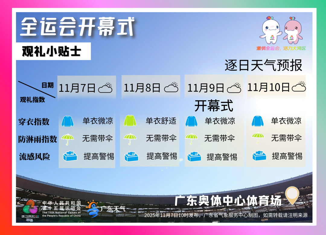 中华人民共和国第十五届全国运动会将于11月9日在广州开幕,开幕倒计时仅剩2天,大广东正以最绚丽的姿态、最昂扬的精神,迎接盛会的到来,天气会怎么样呢?一起来看看。