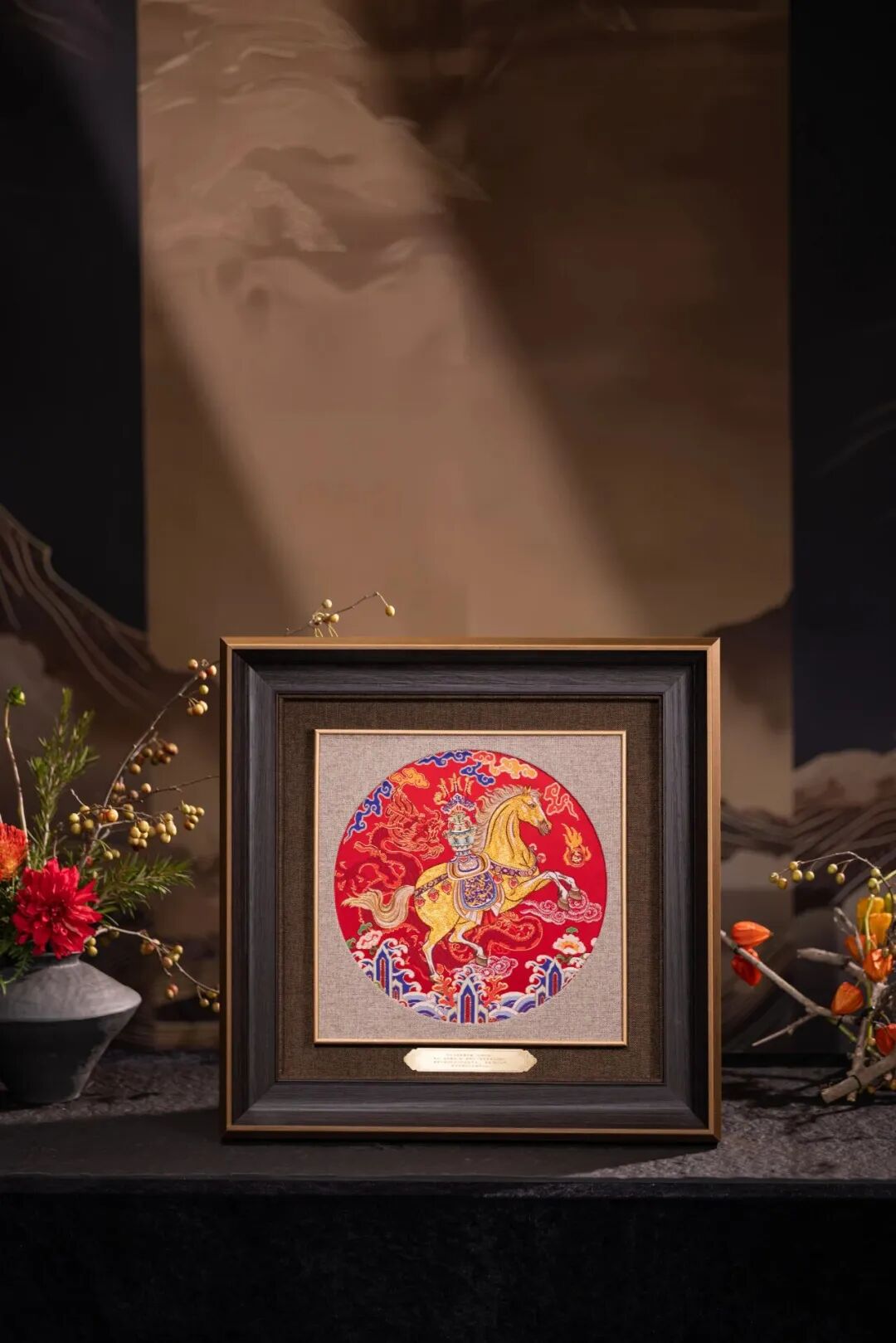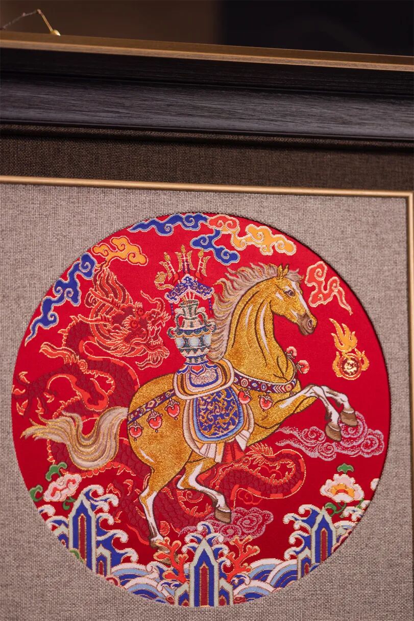 这件作品在继承古代织造技法的同时,还大胆运用现代材料与工艺进行创新,将鸵鸟羽毛与真螺钿线织入锦面,并通过金线晕色技术使马身呈现细腻的光影变化。