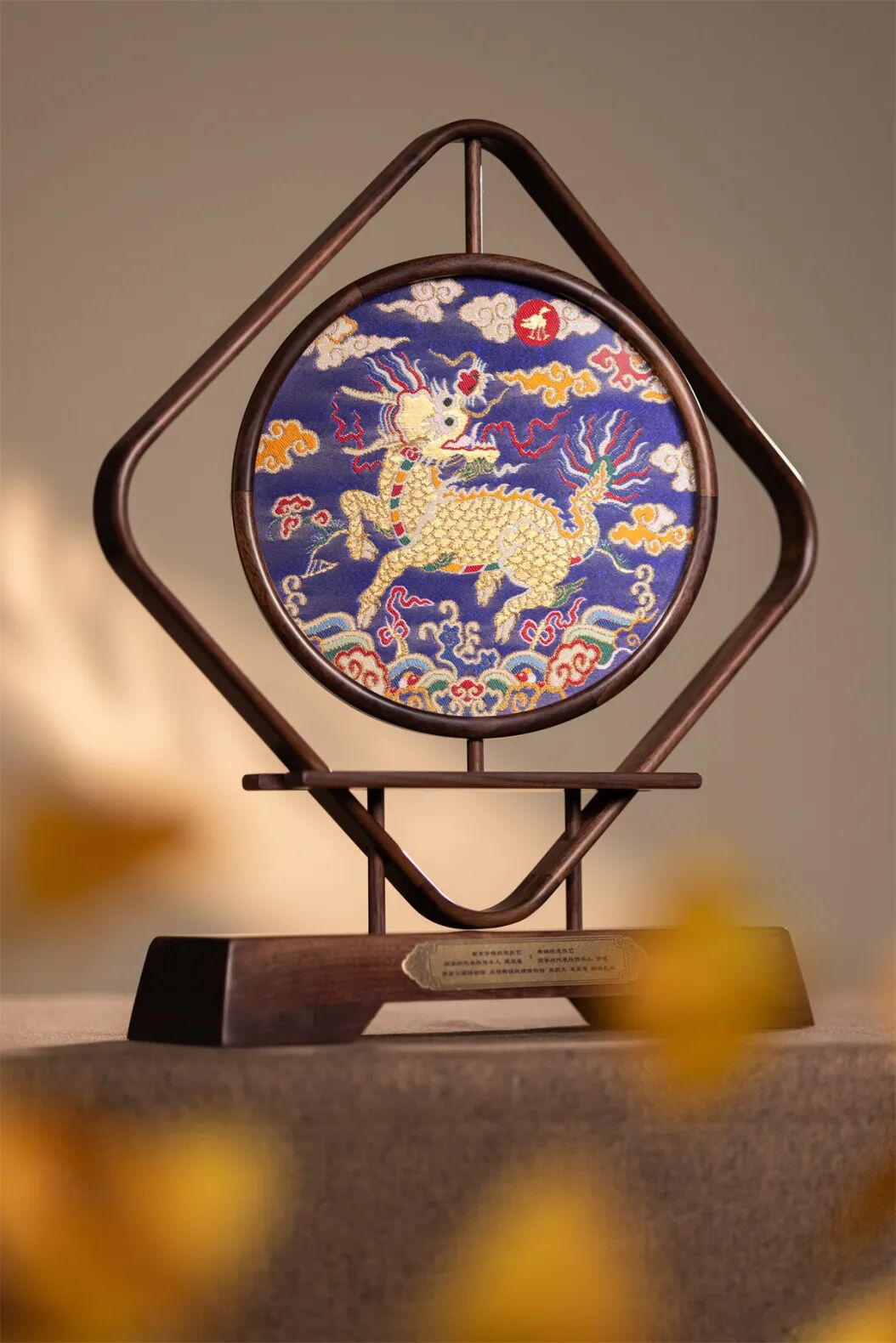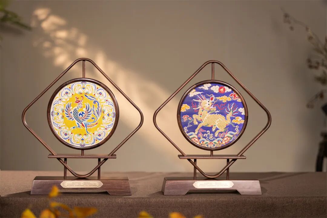 一面以蜀锦技艺织就凤凰,另一面则以云锦技艺呈现麒麟,其灵感来源于《宋书·符瑞志中》与《宋史·乐一》的祥瑞记载。