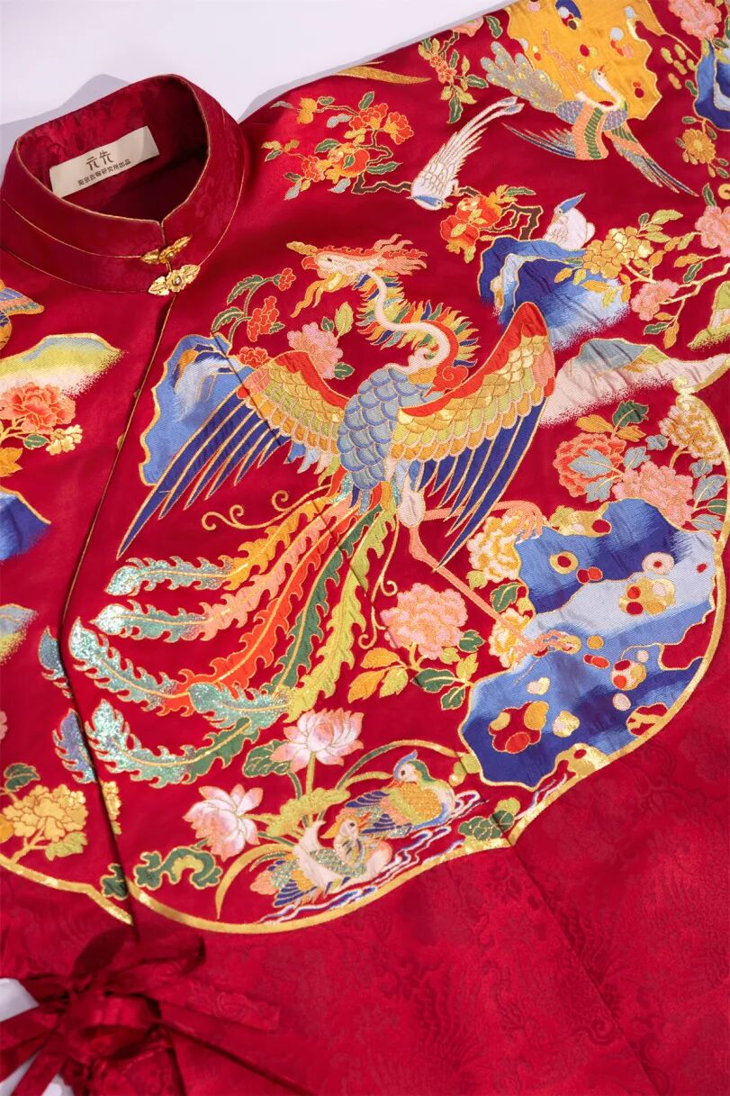 《百鸟朝凤吉服》,以明代经典的柿蒂纹为底,衣身精心织就了仙鹤、锦鸡等九种祥瑞鸟禽,锦面还缀以牡丹、荷花等四季花卉,寓意吉祥。