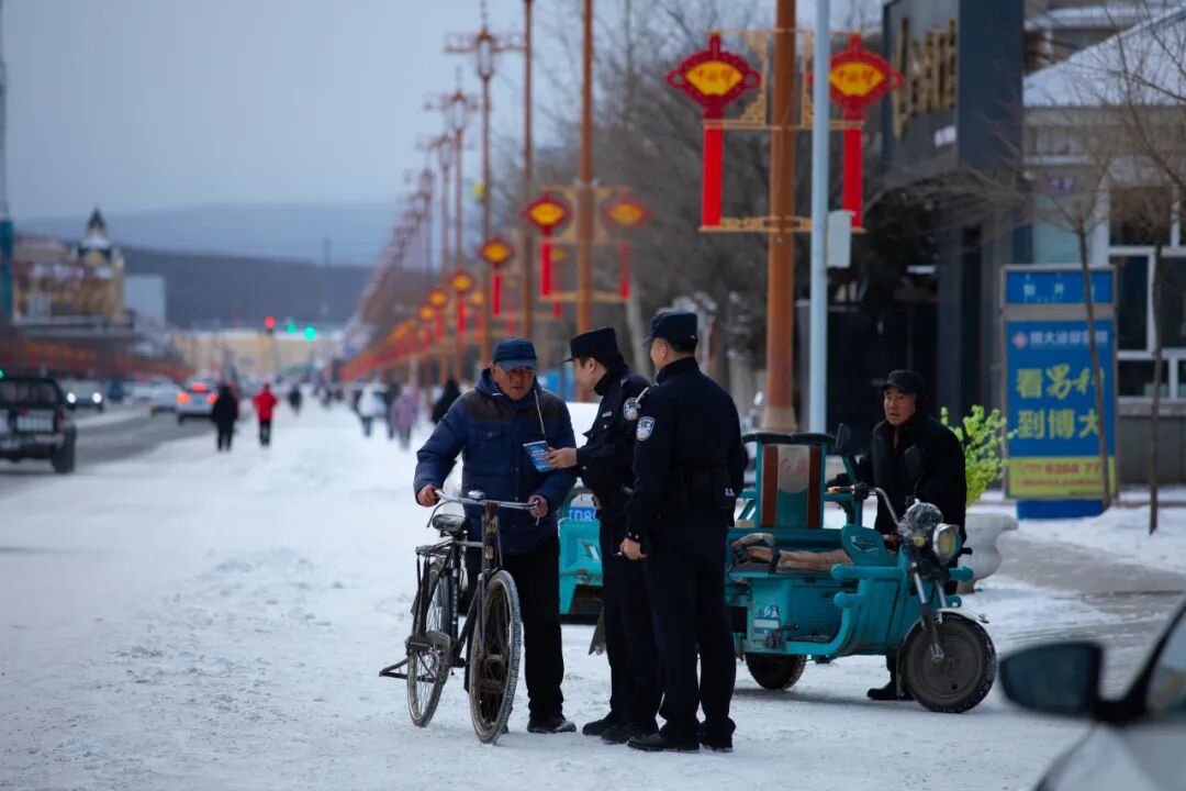 寒冬腊月,根河市白雪皑皑的街头,一抹“藏蓝”身影为群众筑起温暖的安全屏障。街道上,两名民警正耐心向骑自行车的老人讲解冬季出行注意事项,老人紧握车把认真聆听。一旁电动三轮车的老人也驻足关注,民警递上宣传资料,反复叮嘱。这是根河市公安局基层民警日常工作的缩影。“我们多走一步、多提醒一句,群众的安全就多一份保障。”执勤民警表示,冬季是交通事故高发期,老年人出行需格外留意,面对面交流能让安全知识更入人心。大雪之下,这些“平安守护人”用坚守与温情,让整座小城的冬日满是暖意。