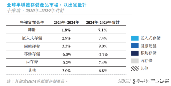 预计未来五年,随着AI技术突破带来的新的存储需求与存储产品本身的技术产品升级驱动,全球半导体存储产品市场规模(以出货量计)将增长至2029年的194亿块,2024年至2029年的年复合增长率达7.1%。